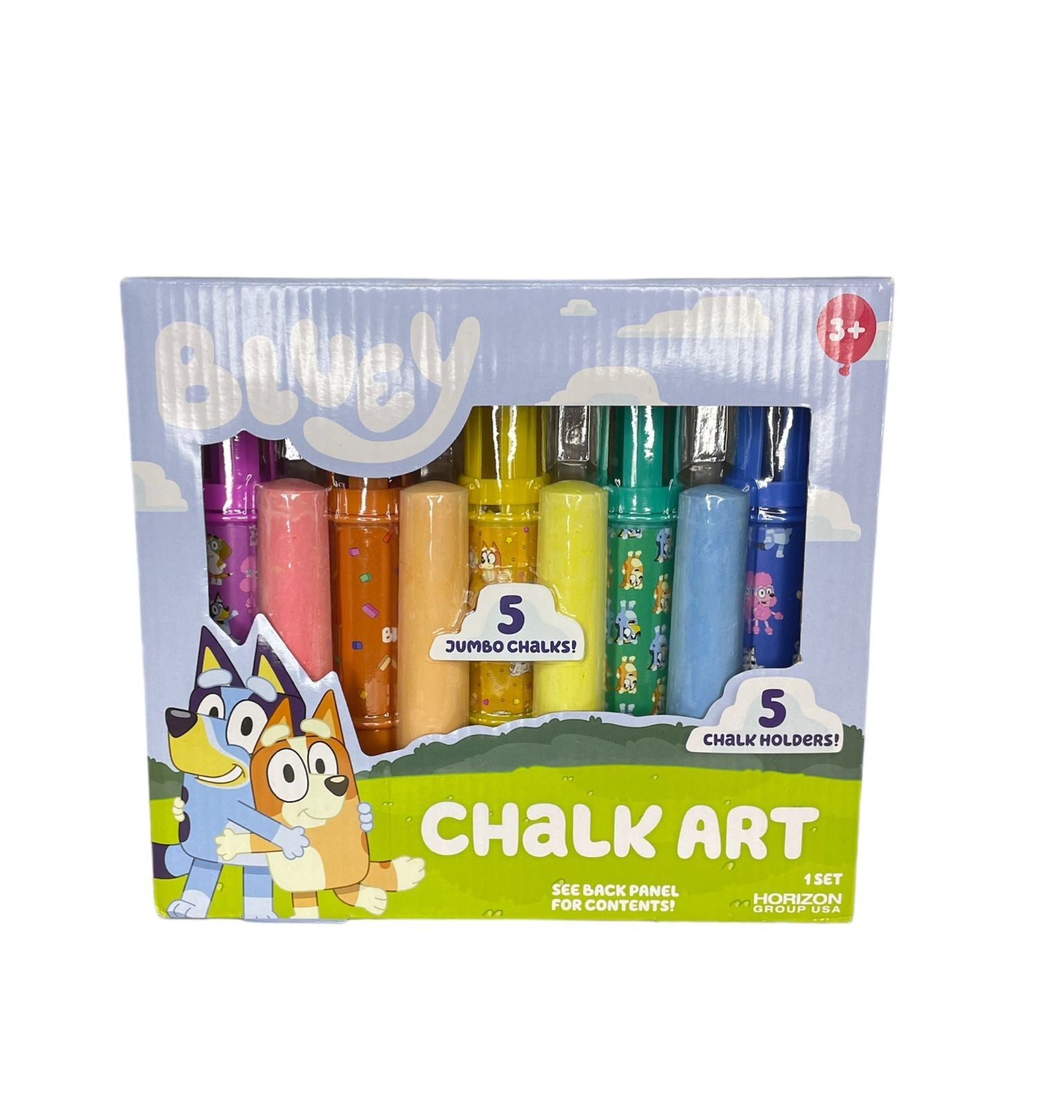 Este juego de 5 gises con soportes de Bluey es perfecto para que los niños exploren su creatividad mientras juegan al aire libre. Cada gis viene con un soporte con la forma de Bluey, el popular personaje de la serie animada. Los colores vibrantes y la textura suave de los gises permiten a los niños dibujar y crear obras de arte en aceras y superficies similares de forma fácil y divertida.